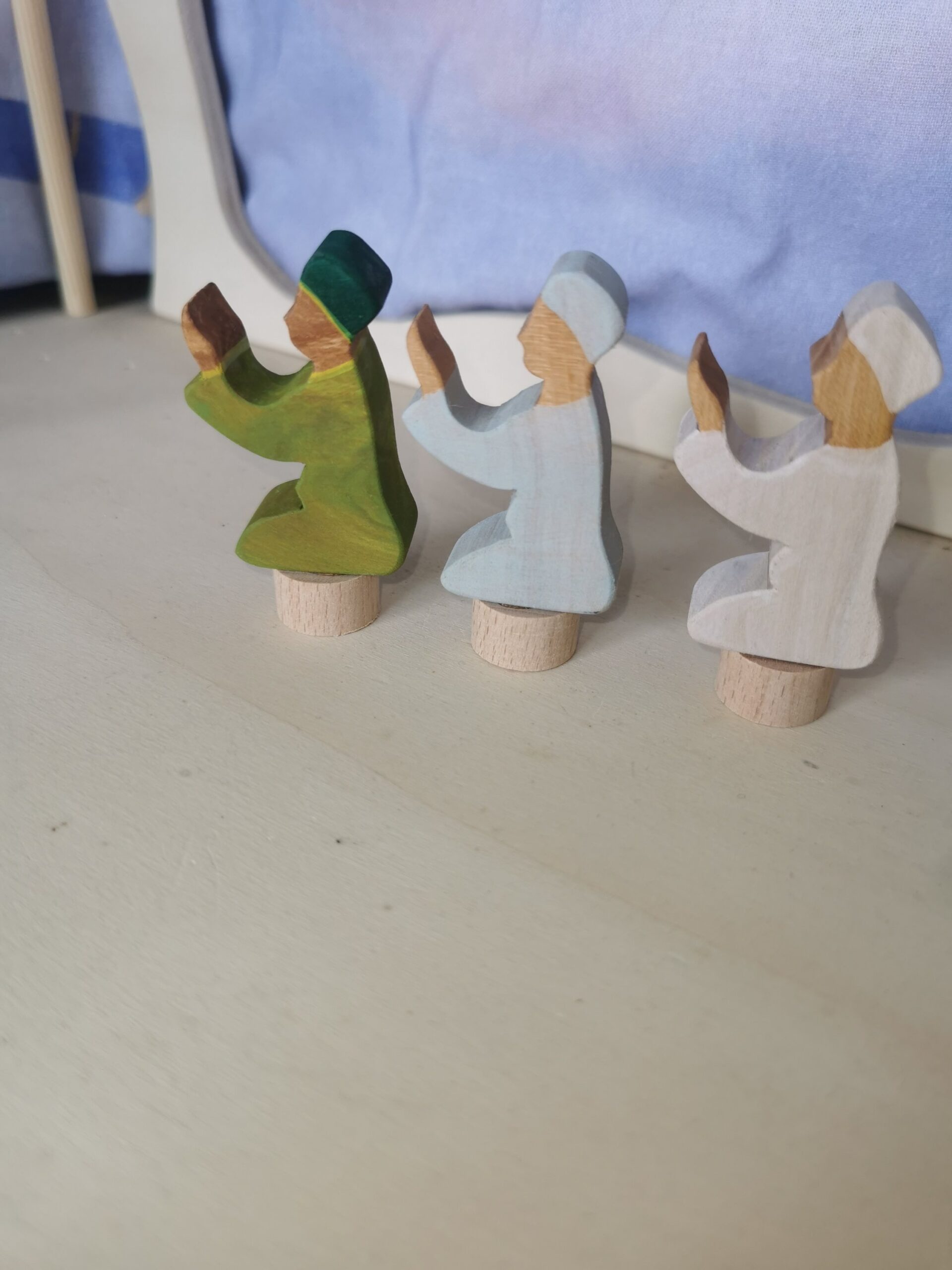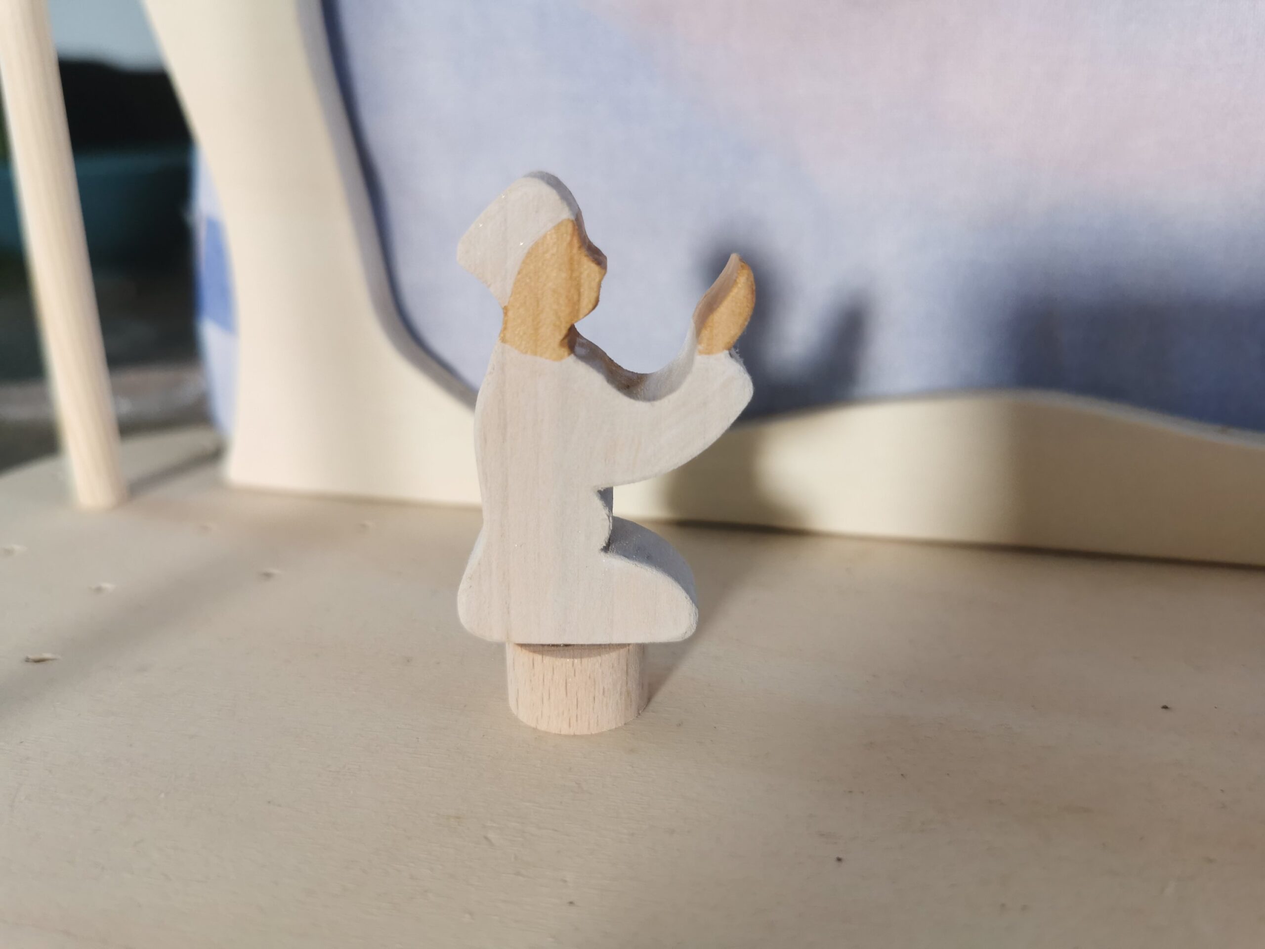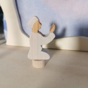 Steker van een biddende man in groene kledij. Gemaakt van lokaal perenhout en afgewerkt met natuurlijke hard-wax olie.